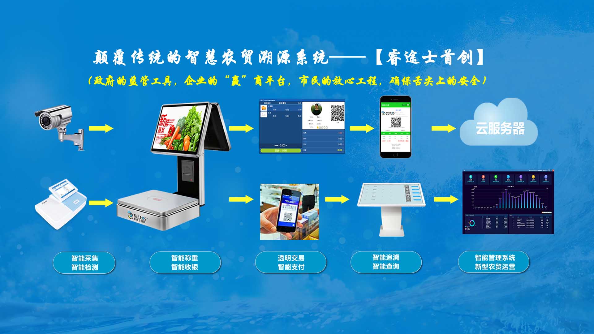 創新實現了【智慧農貿溯源管理系統】與【智能稱重收銀】一體化解決方案,集市場管理、運營管理、溯源追溯、智能收銀大數據運用于一體,硬件、軟件與管理系統完美結合。適用于農批、農貿市場蔬菜、生鮮、水果、水產、肉類、熟食等稱重和非稱重銷售;由于采用一體化設計,解決了傳統農貿市場無法實現的信息化、智能化、可追溯的管理問題;使稱重、收銀、追溯、管理、更透明、公正、安全,讓顧客無后顧之憂,給管理工作帶來極大的便捷與高效,對國內農產品行業的發展、農產品流通管理起到了典范作用。